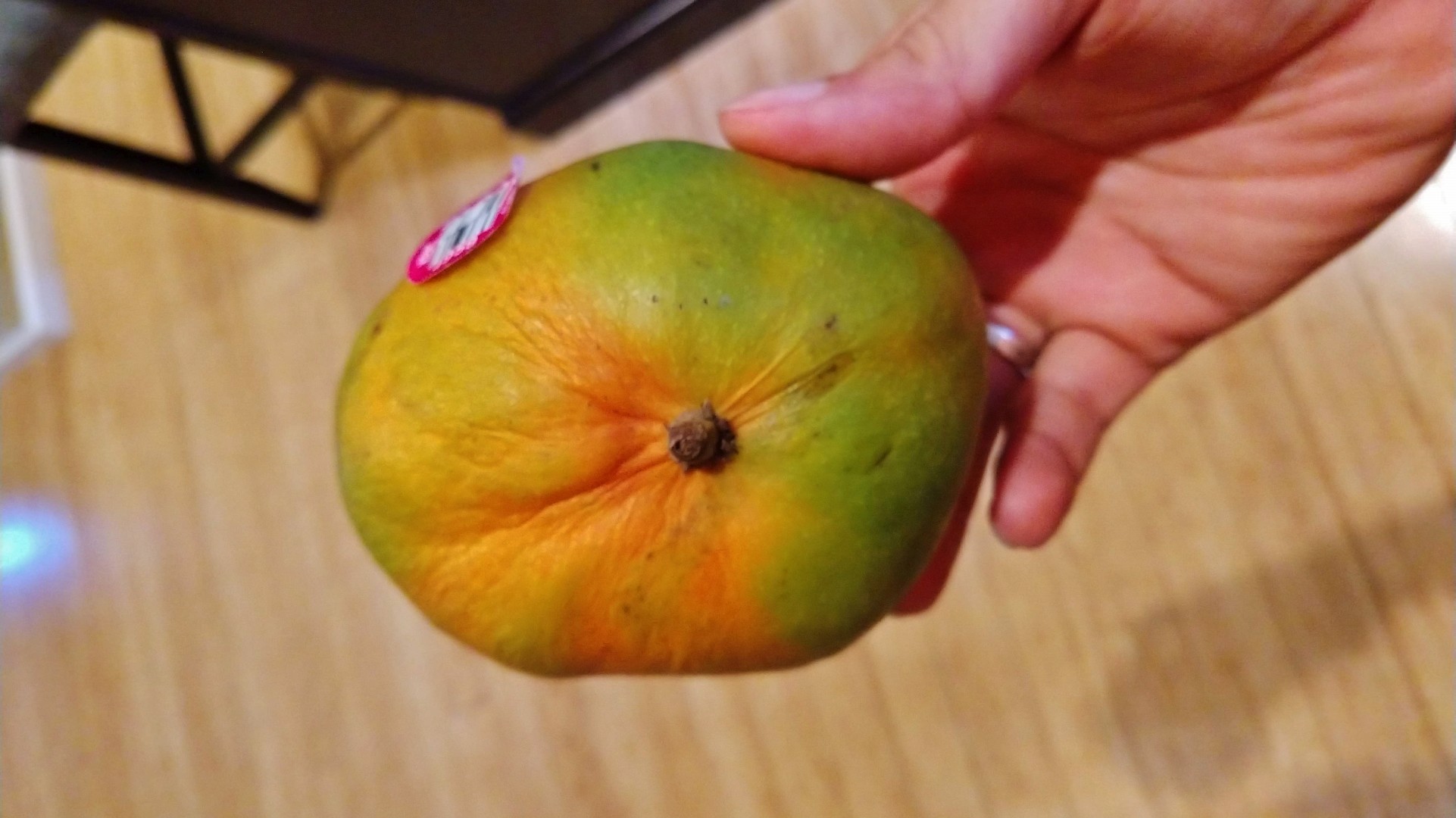 Now, about the Kent mango. This is a tricky one to tell when it is ripe. Some of them are ripe green, some have a reddish top and they could be ripe too. If they get soft, they are overripe and often will turn black inside. So you have to cut them at the right time. Slightly under-ripe Kent mangoes taste decent but if you get them just right, they are out of this world. The best way to tell ripeness is I’d say by looking at a combination of softness – still firm but with a slight give – and the number or wrinkles. All these photos are of a perfectly ripe Kent mango. Here is a top view showing the wrinkles: